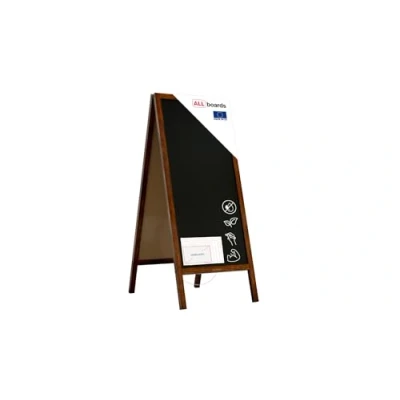 SURFACE - scratch-resistant, high quality surface made of high-density HDF fibreboard varnished black, can be written on both sides. The surface is not waterproof FRAME - light frame made of natural wood, covered with brown stain and varnish DIMENSIONS - total height 150x61cm, total width 61cm, writing area 120x53cm, frame width 4cm, frame thickness 2cm, stand 30cm APPLICATION AREA - acts as an effective menu for catering establishments, pubs and shops USE - ideal for writing on with chalk or chalk markers