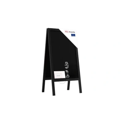 SURFACE - waterproof, scratch-resistant, high quality surface made of high-density HDF fibreboard varnished black, can be written on both sides. FRAME - light frame made of natural wood, covered with pink stain and varnish DIMENSIONS – total height 100cm, total width 49,5cm, writing area 74x43cm, frame width 3,5cm, frame thickness 2cm, stand 27cm APPLICATION AREA - acts as an effective menu for catering establishments, pubs and shops USE - ideal for writing on with chalk or chalk markers
