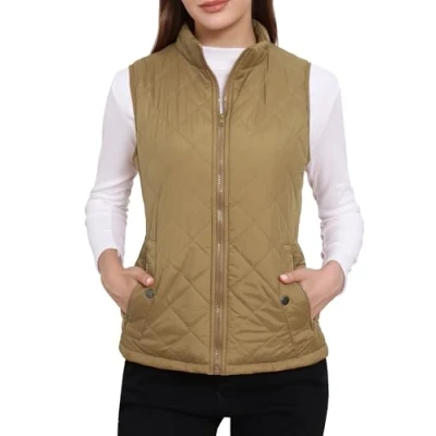Allegra K Women's Body Warmer Stand Collar Lightweight Quilted Zip Jacket Gilet Khaki XL