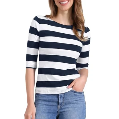 Allegra K Women's Elbow Sleeves Top Casual Boat Neck Slim Fit Stripe T Shirt Blue XL