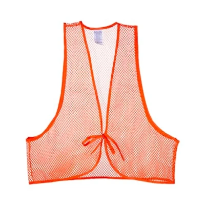 Blaze orange for safety Quiet, 100% polyester One size fits most Machine washable Mesh with front tie closure