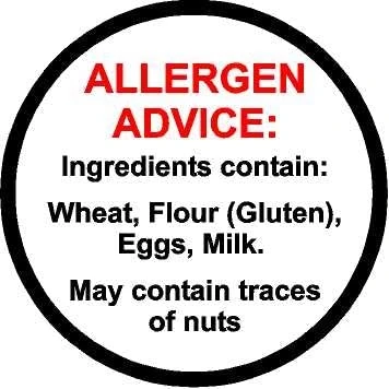 Allergen advice ingredients wheat, flour (Gluten), eggs, milk, may contain nuts Safety label sign Self adhesive sticker 30mm x 30mm Stickers come in sheets of 60 for easy application