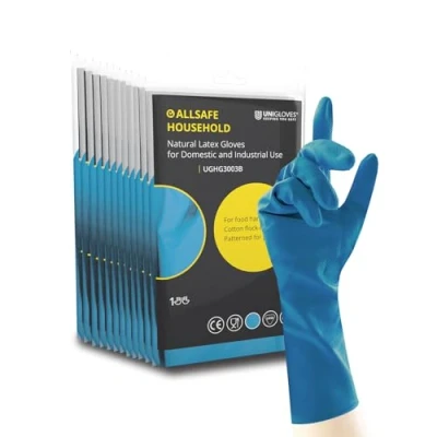 Rubber exterior locks out water and helps protect against detergents and fats. Allsafe can be used across a range of industries including cleaning, janitorial and food processing A soft cotton flock lining helps keep hands feeling cool and dry whilst strong latex ensures durability; suitable for colour-coding in food, cleaning and healthcare environments Anatomically shaped for a more comfortable and ergonomic fit, with a medium weight construction that provides a balance of strength and sensitivity when handling food and substances Reusable, latex household gloves – available in blue, green, pink and yellow Textured finish for superior grip and flock-lining for comfort