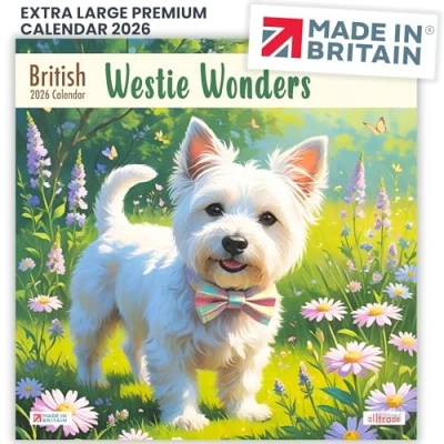 ALLTRADE Calendar 2026 Westie Wonders Month to view Large Wall UK holidays Great Gift for Mom Dad colleague friends & family MADE IN BRITAIN® on FSC® stock with Solar