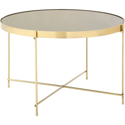 General description A stunning blend of modern design and functionality, the Premier Housewares Allure Large Black Mirror Side Table features a round pane of mirrored glass set into a band of metal. The brushed bronze finish of the metal beautifully complements the black glass, creating an elegant look for any space. Supported by a simple metal lattice, the tabletop is held up by four slim legs, giving the table a lean and sophisticated aesthetic. The base also features a lattice design that introduces angled lines, adding visual interest to the overall design.