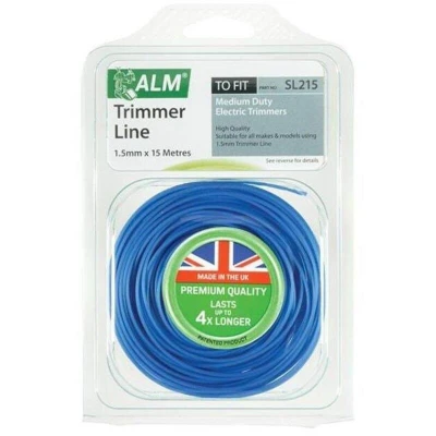 General description This ALM Manufacturing SL215 Medium-Duty Trimmer Line is designed for use with various models of garden trimmers. Manufactured in the UK, this reliable trimmer line is suitable for medium-duty electric and light-duty petrol trimmers that require a 1.5mm diameter line, such as the Trimac 210. Technical specifications Diameter: 1.5mm Length: 15m Color: Blue Type: Trimmer Line MPN: SL215 EAN: 5016531421516 Compatibility and accessories Compatible with most medium-duty electric and light petrol trimmers that use a 1.5mm line Includes compatibility with brands like Trimac 210 Installation Insert the line into the trimmer head following the manufacturer's instructions Ensure the line is properly secured before use Usage Ideal for trimming grass, weeds, and light vegetation Replace the line when it becomes worn or broken to maintain optimal performance Other information