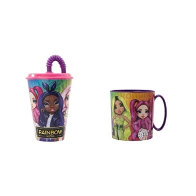 ALMACENESADAN, 4824, Rainbow Back Pack; composed of 350ml microwave cup and 430ml cane cup, reusable product, BPA free Practical mug that will delight the little ones in the house, being decorated with some of their favorite characters from the world of cinema and television. It is microwave-safe, so they are ideal for heating children's breakfast every day and, thanks to their durable material, will withstand accidental drops typical of everyday life. Capacity: 350ml - Microwave safe. - BPA Free - Easy to clean - Fully food-grade material Material Plastic Capacity 350 ml Height 9 cm. Width 8 cm. Bottom 11 cm. Weight 55 g. Comfortable glass made of durable material and decorated with some of the main protagonists of the world of cinema and children's television. Thanks to its lid and straw, children can drink comfortably and safely, avoiding accidental splashing and spilling.