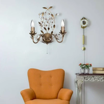 Enchanting 2-bulb Almandite wall light decorated with crystal The beautiful look of the Almandite wall light decorates even the plainest of walls. Just like an ivy plant, the stylised shoots with their crystal buds climb up the wall and brighten up your home even when not switched on. The two lamps project in an artfully curve from the middle of the lamp. When you switch the Almandite lamp on using the pull cord switch, its gold/brass-coloured paintwork shines through the pleasant illumination of the E14 lamps and makes it look even more elegant. All of these components together yield the playfully floral image of a Florentine wall light as represented by the Almandite lamp.