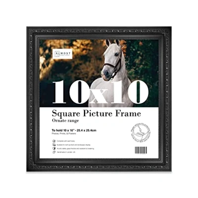 SIZE AND ORIENTATION: This embellished style picture frame is precision cut with machines to ensure it perfectly houses an 10x10 piece of artwork, photo or print. Fold-out wall hooks allow for this picture frame to be easily hung in either landscape or portrait orientation. SUSTAINABLE AND DURABLE MATERIALS: These 10x10 Ornate picture frames are made by expert picture framers using Polecore a sustainable recycled moulding. The window museum quality Perspex glazing for the best possible viewing experience for your pictures. This 10x10 baroque-style picture frame has a vintage style with a Black finish which will look great with any home decor or office. PERFECT FOR ANY OCCASION: Our 10x10 Black ornamental Frame is the perfect way to showcase your favourite artwork, memories, or achievements. Picture frames are often considered extensions of the art and what better way to enhance your beloved artwork than with this 10x10 ornamental Frame. Guaranteed to enhance the decor of your Office or as a gift for a loved one. MADE IN THE UK: All of our picture frames are made in our London-based workshop. We hold ourselves to an incredibly high standard and pride ourselves on putting customer satisfaction first.