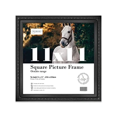 SIZE AND ORIENTATION: This embellished style picture frame is precision cut with machines to ensure it perfectly houses an 11x11 piece of artwork, photo or print. Fold-out wall hooks allow for this picture frame to be easily hung in either landscape or portrait orientation. SUSTAINABLE AND DURABLE MATERIALS: These 11x11 Ornate picture frames are made by expert picture framers using Polecore a sustainable recycled moulding. The window museum quality Perspex glazing for the best possible viewing experience for your pictures. This 11x11 baroque-style picture frame has a vintage style with a Black finish which will look great with any home decor or office. PERFECT FOR ANY OCCASION: Our 11x11 Black ornamental Frame is the perfect way to showcase your favourite artwork, memories, or achievements. Picture frames are often considered extensions of the art and what better way to enhance your beloved artwork than with this 11x11 ornamental Frame. Guaranteed to enhance the decor of your Office or as a gift for a loved one. MADE IN THE UK: All of our picture frames are made in our London-based workshop. We hold ourselves to an incredibly high standard and pride ourselves on putting customer satisfaction first.