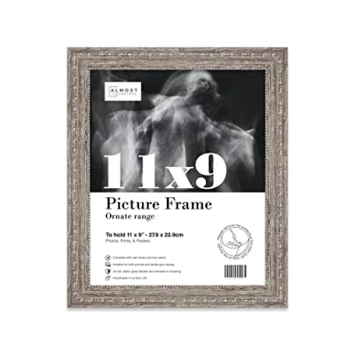 SIZE AND ORIENTATION: This embellished style picture frame is precision cut with machines to ensure it perfectly houses an 11x9 piece of artwork, photo or print. Fold-out wall hooks allow for this picture frame to be easily hung in either landscape or portrait orientation. The fold-out kickstand allows for both vertical and horizontal freestanding display on any bedside table, desk or countertop. SUSTAINABLE AND DURABLE MATERIALS: These 11x9 Ornate picture frames are made by expert picture framers using Polecore a sustainable recycled moulding. The window museum quality Perspex glazing for the best possible viewing experience for your pictures. This 11x9 baroque-style picture frame has a vintage style with a Walnut finish which will look great with any home decor or office. PERFECT FOR ANY OCCASION: Our 11x9 Walnut ornamental Frame is the perfect way to showcase your favourite artwork, memories, or achievements. Picture frames are often considered extensions of the art and what better way to enhance your beloved artwork than with this 11x9 ornamental Frame. Guaranteed to enhance the decor of your Office or as a gift for a loved one. MADE IN THE UK: All of our picture frames are made in our London-based workshop. We hold ourselves to an incredibly high standard and pride ourselves on putting customer satisfaction first.