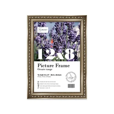 SIZE AND ORIENTATION: This embellished style picture frame is precision cut with machines to ensure it perfectly houses an 12x8 piece of artwork, photo or print. Fold-out wall hooks allow for this picture frame to be easily hung in either landscape or portrait orientation. The fold-out kickstand allows for both vertical and horizontal freestanding display on any bedside table, desk or countertop. SUSTAINABLE AND DURABLE MATERIALS: These 12x8 Ornate picture frames are made by expert picture framers using Polecore a sustainable recycled moulding. The window museum quality Perspex glazing for the best possible viewing experience for your pictures. This 12x8 baroque-style picture frame has a vintage style with a Gunmetal finish which will look great with any home decor or office. PERFECT FOR ANY OCCASION: Our 12x8 Gunmetal ornamental Frame is the perfect way to showcase your favourite artwork, memories, or achievements. Picture frames are often considered extensions of the art and what better way to enhance your beloved artwork than with this 12x8 ornamental Frame. Guaranteed to enhance the decor of your Office or as a gift for a loved one. MADE IN THE UK: All of our picture frames are made in our London-based workshop. We hold ourselves to an incredibly high standard and pride ourselves on putting customer satisfaction first.