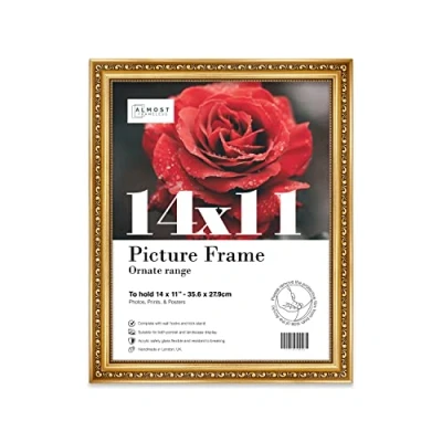 Almost Frameless 14x11 Gold Ornate Picture Frame 14"x11"(35.6x27.9cm) Poster, Photo, Artwork, or Print. Shabby Chic Style Portrait and Landscape Display with Wall Hooks