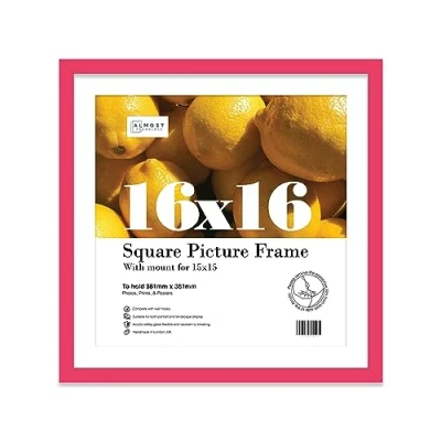 QUALITY Bright Pink 16x16 PICTURE FRAME: This 16x16 With mount for 15x15 Print, Poster or Photo Picture Frame is perfect for displaying your cherished prints, posters, artwork or photos. With its Thin edge lightweight design, this picture frame will comfortably take your 16x16 For 15x15 artwork. SUSTAINABLE AND DURABLE MATERIALS: These 16x16 With mount for 15x15 Stylish and thin picture frames are made by expert picture framers using Polecore a sustainable recycled moulding. The window museum quality Perspex glazing for the best possible viewing experience for your pictures. This 16x16 With mount for 15x15 slim-edged picture frame has a modern style with a Bright Pink finish which will look great with any home décor or office. SIZE AND ORIENTATION: This embellished style picture frame is precision cut with machines to ensure it perfectly houses a 16x16 mount to take a 15x15 piece of artwork, photo or print. If you wish you can remove the mount to display an 16x16" print.Fold-out wall hooks allow for this picture frame to be easily hung in either landscape or portrait orientation. PERFECT FOR ANY OCCASION: Our 16x16 With mount for 15x15 Bright Pink Picture Frame is the perfect way to showcase your favourite artwork, memories, or achievements. Picture frames are often considered extensions of the art and what better way to enhance your beloved artwork than with this 16x16 With mount for 15x15 lightweight thin edge photo frame. Guaranteed to enhance the décor of your Office or as a gift for a loved one. MADE IN THE UK: All of our picture frames are made in our London-based workshop. We hold ourselves to an incredibly high standard and pride ourselves on putting customer satisfaction first.