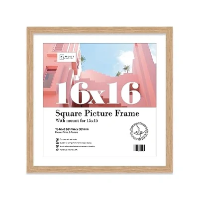 QUALITY Oak 16x16 PICTURE FRAME: This 16x16 With mount for 15x15 Print, Poster or Photo Picture Frame is perfect for displaying your cherished prints, posters, artwork or photos. With its Thin edge lightweight design, this picture frame will comfortably take your 16x16 For 15x15 artwork. SUSTAINABLE AND DURABLE MATERIALS: These 16x16 With mount for 15x15 Stylish and thin picture frames are made by expert picture framers using Polecore a sustainable recycled moulding. The window museum quality Perspex glazing for the best possible viewing experience for your pictures. This 16x16 With mount for 15x15 slim-edged picture frame has a modern style with a Oak finish which will look great with any home décor or office. SIZE AND ORIENTATION: This embellished style picture frame is precision cut with machines to ensure it perfectly houses a 16x16 mount to take a 15x15 piece of artwork, photo or print. If you wish you can remove the mount to display an 16x16" print.Fold-out wall hooks allow for this picture frame to be easily hung in either landscape or portrait orientation. PERFECT FOR ANY OCCASION: Our 16x16 With mount for 15x15 Oak Picture Frame is the perfect way to showcase your favourite artwork, memories, or achievements. Picture frames are often considered extensions of the art and what better way to enhance your beloved artwork than with this 16x16 With mount for 15x15 lightweight thin edge photo frame. Guaranteed to enhance the décor of your Office or as a gift for a loved one. MADE IN THE UK: All of our picture frames are made in our London-based workshop. We hold ourselves to an incredibly high standard and pride ourselves on putting customer satisfaction first.