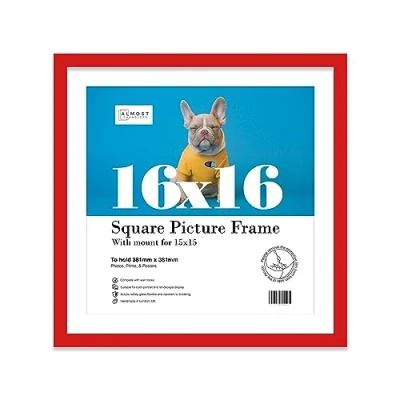 QUALITY Red 16x16 PICTURE FRAME: This 16x16 With mount for 15x15 Print, Poster or Photo Picture Frame is perfect for displaying your cherished prints, posters, artwork or photos. With its Thin edge lightweight design, this picture frame will comfortably take your 16x16 For 15x15 artwork. SUSTAINABLE AND DURABLE MATERIALS: These 16x16 With mount for 15x15 Stylish and thin picture frames are made by expert picture framers using Polecore a sustainable recycled moulding. The window museum quality Perspex glazing for the best possible viewing experience for your pictures. This 16x16 With mount for 15x15 slim-edged picture frame has a modern style with a Red finish which will look great with any home décor or office. SIZE AND ORIENTATION: This embellished style picture frame is precision cut with machines to ensure it perfectly houses a 16x16 mount to take a 15x15 piece of artwork, photo or print. If you wish you can remove the mount to display an 16x16" print.Fold-out wall hooks allow for this picture frame to be easily hung in either landscape or portrait orientation. PERFECT FOR ANY OCCASION: Our 16x16 With mount for 15x15 Red Picture Frame is the perfect way to showcase your favourite artwork, memories, or achievements. Picture frames are often considered extensions of the art and what better way to enhance your beloved artwork than with this 16x16 With mount for 15x15 lightweight thin edge photo frame. Guaranteed to enhance the décor of your Office or as a gift for a loved one. MADE IN THE UK: All of our picture frames are made in our London-based workshop. We hold ourselves to an incredibly high standard and pride ourselves on putting customer satisfaction first.