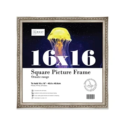 SIZE AND ORIENTATION: This embellished style picture frame is precision cut with machines to ensure it perfectly houses an 16x16 piece of artwork, photo or print. Fold-out wall hooks allow for this picture frame to be easily hung in either landscape or portrait orientation. SUSTAINABLE AND DURABLE MATERIALS: These 16x16 Ornate picture frames are made by expert picture framers using Polecore a sustainable recycled moulding. The window museum quality Perspex glazing for the best possible viewing experience for your pictures. This 16x16 baroque-style picture frame has a vintage style with a Silver finish which will look great with any home decor or office. PERFECT FOR ANY OCCASION: Our 16x16 Silver ornamental Frame is the perfect way to showcase your favourite artwork, memories, or achievements. Picture frames are often considered extensions of the art and what better way to enhance your beloved artwork than with this 16x16 ornamental Frame. Guaranteed to enhance the decor of your Office or as a gift for a loved one. MADE IN THE UK: All of our picture frames are made in our London-based workshop. We hold ourselves to an incredibly high standard and pride ourselves on putting customer satisfaction first.