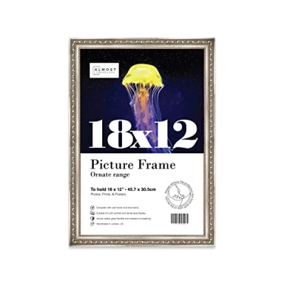 SIZE AND ORIENTATION: This embellished style picture frame is precision cut with machines to ensure it perfectly houses an 18x12 piece of artwork, photo or print. Fold-out wall hooks allow for this picture frame to be easily hung in either landscape or portrait orientation. SUSTAINABLE AND DURABLE MATERIALS: These 18x12 Ornate picture frames are made by expert picture framers using Polecore a sustainable recycled moulding. The window museum quality Perspex glazing for the best possible viewing experience for your pictures. This 18x12 baroque-style picture frame has a vintage style with a Silver finish which will look great with any home decor or office. PERFECT FOR ANY OCCASION: Our 18x12 Silver ornamental Frame is the perfect way to showcase your favourite artwork, memories, or achievements. Picture frames are often considered extensions of the art and what better way to enhance your beloved artwork than with this 18x12 ornamental Frame. Guaranteed to enhance the decor of your Office or as a gift for a loved one. MADE IN THE UK: All of our picture frames are made in our London-based workshop. We hold ourselves to an incredibly high standard and pride ourselves on putting customer satisfaction first.