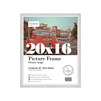 SIZE AND ORIENTATION: This embellished style picture frame is precision cut with machines to ensure it perfectly houses an 20x16 piece of artwork, photo or print. Fold-out wall hooks allow for this picture frame to be easily hung in either landscape or portrait orientation. SUSTAINABLE AND DURABLE MATERIALS: These 20x16 Ornate picture frames are made by expert picture framers using Polecore a sustainable recycled moulding. The window museum quality Perspex glazing for the best possible viewing experience for your pictures. This 20x16 baroque-style picture frame has a vintage style with a White finish which will look great with any home decor or office. PERFECT FOR ANY OCCASION: Our 20x16 White ornamental Frame is the perfect way to showcase your favourite artwork, memories, or achievements. Picture frames are often considered extensions of the art and what better way to enhance your beloved artwork than with this 20x16 ornamental Frame. Guaranteed to enhance the decor of your Office or as a gift for a loved one. MADE IN THE UK: All of our picture frames are made in our London-based workshop. We hold ourselves to an incredibly high standard and pride ourselves on putting customer satisfaction first.
