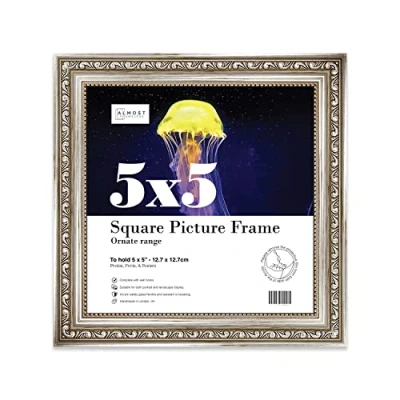 SIZE AND ORIENTATION: This embellished style picture frame is precision cut with machines to ensure it perfectly houses an 5x5 piece of artwork, photo or print. Fold-out wall hooks allow for this picture frame to be easily hung in either landscape or portrait orientation. The fold-out kickstand allows for both vertical and horizontal freestanding display on any bedside table, desk or countertop. SUSTAINABLE AND DURABLE MATERIALS: These 5x5 Ornate picture frames are made by expert picture framers using Polecore a sustainable recycled moulding. The window museum quality Perspex glazing for the best possible viewing experience for your pictures. This 5x5 baroque-style picture frame has a vintage style with a Silver finish which will look great with any home decor or office. PERFECT FOR ANY OCCASION: Our 5x5 Silver ornamental Frame is the perfect way to showcase your favourite artwork, memories, or achievements. Picture frames are often considered extensions of the art and what better way to enhance your beloved artwork than with this 5x5 ornamental Frame. Guaranteed to enhance the decor of your Office or as a gift for a loved one. MADE IN THE UK: All of our picture frames are made in our London-based workshop. We hold ourselves to an incredibly high standard and pride ourselves on putting customer satisfaction first.