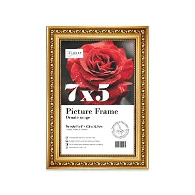 Almost Frameless 7x5 Gold Ornate Picture Frame 7"x5"(17.7x12.7cm) Poster, Photo, Artwork, or Print. Shabby Chic Style Portrait and Landscape Display with Wall Hooks