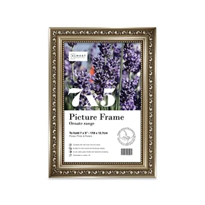 SIZE AND ORIENTATION: This embellished style picture frame is precision cut with machines to ensure it perfectly houses an 7x5 piece of artwork, photo or print. Fold-out wall hooks allow for this picture frame to be easily hung in either landscape or portrait orientation. The fold-out kickstand allows for both vertical and horizontal freestanding display on any bedside table, desk or countertop. SUSTAINABLE AND DURABLE MATERIALS: These 7x5 Ornate picture frames are made by expert picture framers using Polecore a sustainable recycled moulding. The window museum quality Perspex glazing for the best possible viewing experience for your pictures. This 7x5 baroque-style picture frame has a vintage style with a Gunmetal finish which will look great with any home decor or office. PERFECT FOR ANY OCCASION: Our 7x5 Gunmetal ornamental Frame is the perfect way to showcase your favourite artwork, memories, or achievements. Picture frames are often considered extensions of the art and what better way to enhance your beloved artwork than with this 7x5 ornamental Frame. Guaranteed to enhance the decor of your Office or as a gift for a loved one. MADE IN THE UK: All of our picture frames are made in our London-based workshop. We hold ourselves to an incredibly high standard and pride ourselves on putting customer satisfaction first.