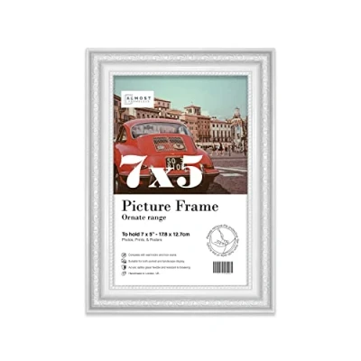 Almost Frameless 7x5 White Ornate Picture Frame 7"x5"(17.7x12.7cm) Poster, Photo, Artwork, or Print. Opulent Style Portrait and Landscape Display with Wall Hooks