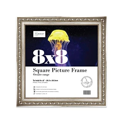 SIZE AND ORIENTATION: This embellished style picture frame is precision cut with machines to ensure it perfectly houses an 8x8 piece of artwork, photo or print. Fold-out wall hooks allow for this picture frame to be easily hung in either landscape or portrait orientation. The fold-out kickstand allows for both vertical and horizontal freestanding display on any bedside table, desk or countertop. SUSTAINABLE AND DURABLE MATERIALS: These 8x8 Ornate picture frames are made by expert picture framers using Polecore a sustainable recycled moulding. The window museum quality Perspex glazing for the best possible viewing experience for your pictures. This 8x8 baroque-style picture frame has a vintage style with a Silver finish which will look great with any home decor or office. PERFECT FOR ANY OCCASION: Our 8x8 Silver ornamental Frame is the perfect way to showcase your favourite artwork, memories, or achievements. Picture frames are often considered extensions of the art and what better way to enhance your beloved artwork than with this 8x8 ornamental Frame. Guaranteed to enhance the decor of your Office or as a gift for a loved one. MADE IN THE UK: All of our picture frames are made in our London-based workshop. We hold ourselves to an incredibly high standard and pride ourselves on putting customer satisfaction first.