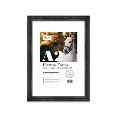 Almost Frameless A2 Black Ornate Picture Frame with White Mount for A3 (29.7 x 42cm 11.7 16.5in) Poster, Photo, Artwork, or Print. Antique Style Portrait and Landscape Display Wall Hooks