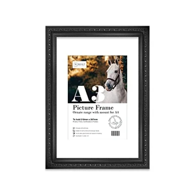 Almost Frameless A3 Black Ornate Picture Frame with White Mount for A4 (21 x 29.7cm 8.3 11.7in) Poster, Photo, Artwork, or Print. Opulent Style Portrait and Landscape Display Wall Hooks