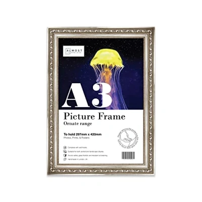 Almost Frameless A3 Silver Ornate Picture Frame Fits (29.7 x 42cm 11.7 16.5in) Poster, Photo, Artwork, or Print. Antique Style Portrait and Landscape Display with Wall Hooks