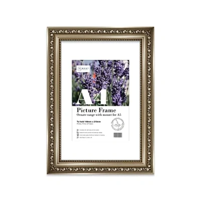 SIZE AND ORIENTATION: This embellished style picture frame is precision cut with machines to ensure it perfectly houses an A4 mount to take a A5 piece of artwork, photo or print. If you wish you can remove the mount to display an A2 print. Fold-out wall hooks allow for this picture frame to be easily hung in either landscape or portrait orientation. The fold-out kickstand allows for both vertical and horizontal freestanding display on any bedside table, desk or countertop. SUSTAINABLE AND DURABLE MATERIALS: These A4 Ornate picture frames are made by expert picture framers using Polecore a sustainable recycled moulding. The window museum quality Perspex glazing for the best possible viewing experience for your pictures. This A4 baroque-style picture frame has a vintage style with a Gunmetal finish which will look great with any home decor or office. PERFECT FOR ANY OCCASION: Our A4 Gunmetal ornamental Frame is the perfect way to showcase your favourite artwork, memories, or achievements. Picture frames are often considered extensions of the art and what better way to enhance your beloved artwork than with this A4 ornamental Frame. Guaranteed to enhance the decor of your Hallway or as a gift for a loved one. MADE IN THE UK: All of our picture frames are made in our London-based workshop. We hold ourselves to an incredibly high standard and pride ourselves on putting customer satisfaction first.