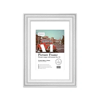 Almost Frameless A4 White Ornate Picture Frame with Mount for A5 (14.8 x 21cm 5.8 8.3in) Poster, Photo, Artwork, or Print. Antique Style Portrait and Landscape Display Wall Hooks