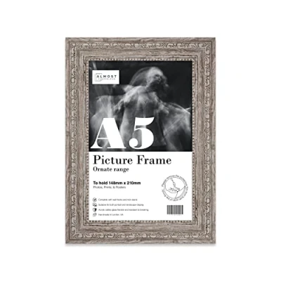 Almost Frameless A5 Walnut Ornate Picture Frame Fits (14.8 x 21cm 5.8 8.3in) Poster, Photo, Artwork, or Print. Antique Style Portrait and Landscape Display with Wall Hooks