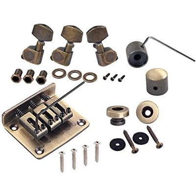 AmazonKit combined with the best crafts for 3-string guitars Material: alloy Perfect for 3 string guitar, replace your worn parts Bronce color Includes a bridge, 1R2L tuning pegs, 2 control knobs, 2 strap locks, 2 keys and screws, washers