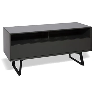 Suitable for up to 50" TVs Add a touch of Scandinavian-inspired style to your home with the Alphason Carbon 1200 TV Stand. The stand is suitable for televisions up to 50” in size, while its angled black metal legs contrast its matte charcoal finish. Accommodate sound bars up to 1150 mm The top internal shelf is designed for modern sound bars, and can fit those up to 1150 mm in size. In addition, passive ventilation with the open design helps keep your electronics cool when in use. Flip down door In keeping with the minimalist styling of the Carbon 1200, the bottom shelf is hidden behind a flip down door. This keeps your devices out of sight when you aren't using them, without interfering with the audio from your sound bar on the shelf above. _________________________________________________________________________ Please note: Screen sizes are a guide only, and it's recommended that you measure the width of your TV, particularly if your TV doesn't have a central base. Recommended screen sizes with split feet may overhang the edge of the stand.