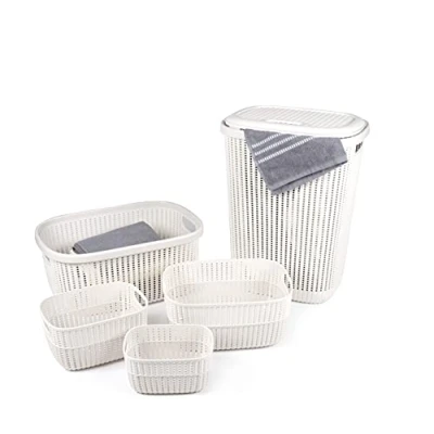 Alpina Laundry Basket Set 5 Pieces 1 with Lid Plastic Knitting Pattern Beige
