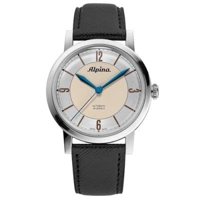 The Alpina Startimer Heritage is a reissue of one of Alpina's earliest pilot watches. Staying true to the original design, this timepiece is steeped in vintage style. This Analogue watch is equipped with a Swiss Made Movement High quality Black Leather strap, measuring 21 cm in length and 18 mm in width, with a Buckle Case diameter: 38 mm,case thickness: 10 mm, case colour: Silver and dial colour: Beige The watch is delivered in an original gift box and has a warranty of 2 years