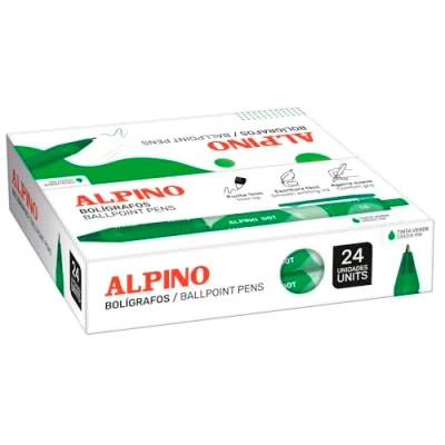 Pack of 24 plain green ballpoint pens for a different and dynamic writing – the box of 24 Alpino Dot pens in green ink is perfect for those looking for a distinctive touch in their writing. Its vibrant color is ideal for annotations, corrections, underlining and creative uses, making it an essential addition to the office, school or home. ✍️ RETRACTABLE SYSTEM FOR COMFORT AND DURABILITY - With its retractable mechanism, this pen activates with a single click, protecting the tip and preventing accidental stains on bags or documents. A practical and efficient system that optimizes its use in any environment. SOFT & NON-SLIP GRIP FOR AN ERGONOMIC EXPERIENCE – Designed for effortless prolonged writing, the Alpino Dot Pen features a soft touch finish and non-slip grip, providing firm, comfortable control that prevents slippage and hand fatigue. ️ 1MM TIP FOR CLEAN AND CONSISTENT WRITING - Its 1mm tip allows a precise, fluid and even stroke, ideal for office tasks, creative writing or note-taking. Its high quality green ink ensures intense and long-lasting colour with every writing. 24 PACK BOX FOR HIGHER AVAILABILITY AND PERFORMANCE - This pack of 24 Alpino Dot pens in green ink is the perfect choice for those who need a constant supply of reliable pens. Its stylish and functional design ensures an optimal writing experience in any situation.