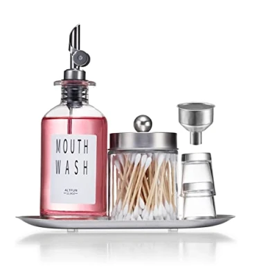 Modern Home Essential : Minimalism Inspired Design for Mouthwash Dispenser Bottle.They look good in any decor.Great set with a nice look to it that is both practical and functional as well. Premium Quality : Lotion bottle made with thick glass,durable and stable.Food grade rubber gasket top fits snugly and securely into the bottle neck with no leaking.The stainless steel spout with a cap to stop any dust or other yuck from falling in and easily out of when pouring.Tray made with stainless steel with non-slip pads. Easy to Use : This weighted metal pourer paired with the perfect size of the bottles make it easier for you to pour mouthwash. The Weighted Pourer has a beautiful mechanism that allows controlled, accurate, and consistent pour. Reusable with the funnel and glass cups. Package Included : Lotion dispenser set come one 11.8oz mouthwash glass dispenser with s/s pourer, 1 qtip holder with s/s lid, 2 glasses, 1 stainless steel funnel, and tray, 2 labels, and 2 no-slip pads.Will make your wash basin well organized. An Idea Gift : This mouthwash dispenser set is perfect for daily use or as a house warming gift for both yourself and your friends. They are well Packaged with foam in a box.