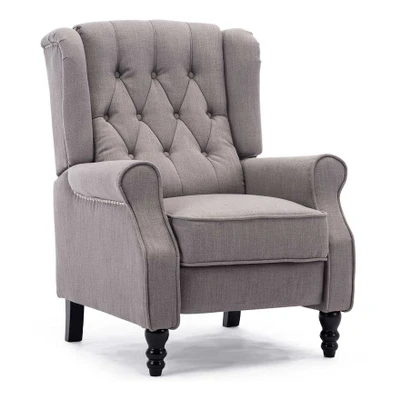 General description The Althorpe Wing Back Deep Button Pushback Recliner Chair in Grey is a striking piece that adds elegance to any space. With its classic wingback design, dark wooden legs, and stud detailing, this chair is perfect for a living room, study, or library. Beyond its aesthetic appeal, it features a secret recline function that enhances comfort. Technical specifications Height: 105 cm Width: 78 cm Depth: 82 cm Seat Height: 48 cm Seat Width: 51 cm Seat Depth: 50 cm Backrest Height: 62 cm Backrest Width: 70 cm Recline Dimensions: H: 86 cm x W: 78 cm x D: 156 cm Installation To operate the Push Back mechanism, place your hands on the armrests and lean back using your body weight while pushing forward on the arms. The footrest will rise as the back reclines. To return to the upright position, gently push the footrest down with your legs while leaning forward. Usage Ideal for relaxing near the fireplace or as a stylish addition to any room. Comfortably padded for support and