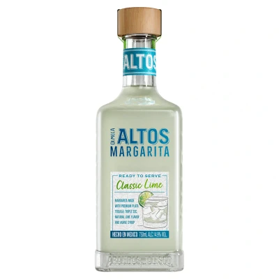 Altos Margarita 75cl is a ready-to-drink classic lime margarita crafted with award-winning Olmeca Altos Plata tequila. Simply pour over ice to enjoy bar-quality margaritas at home, featuring bright lime flavor and smooth agave character—perfect for any occasion. Contains sulphites. 14.9% ABV.