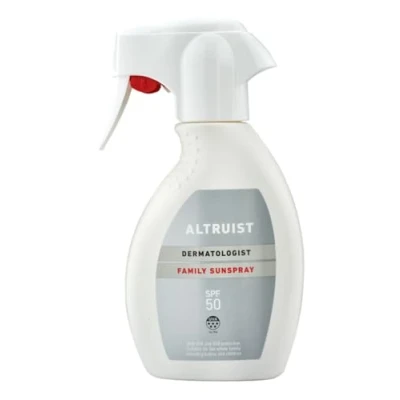 DERMATOLOGIST SPECIFICATION FAMILY SUNSPRAY SPF50 WITH A 5-STAR UVA PROTECTION - created by dermatologist Andrew Birnie SPF50 SPRAY SUITABLE FOR THE WHOLE FAMILY, INCLUDING BABIES (+6 months) AND CHILDREN - The product comes in a new trigger spray format, ensuring it’s easy to apply. Simply spray it on and rub it in 5-STAR UVA PROTECTION (PPD 48) - Broad spectrum UVA and UVB protection SUITABLE FOR SENSITIVE SKIN FRAGRANCE AND PARABEN FREE REEF FRIENDLY (OCTOCRYLENE, OCTINOXATE AND OXYBENZONE FREE) - perfect for a day at the beach. SUITABLE FOR VEGANS ALTRUIST SUPPORTS PEOPLE WITH ALBINISM IN AFRICA - 10p from every Altruist product sold is donated to charities supporting people with albinism. Altruist has donated over 550,000 in products to protect people with albinism since 2016.