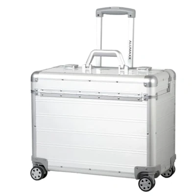 High-quality Pandora pilot case from Alumaxx made of matt silver aluminium Lockable telescopic trolley system (103 cm), 4 high-quality 360° smooth-running wheels, representative look, ergonomic carrying handle, reinforced edges, lock system with double locking and automatic opening In the lid: 4 business card slots, 2 SD card slots, mesh pocket, 3 elastic loops - Inlay: tablet compartment (up to 14 inches), mobile phone case, 2 pen loops, 8 business card slots, 2 SD card slots, mesh pocket and compartment for USB sticks and cables Outer dimensions: approx. 36 x 47 x 25 cm. Inner dimensions: approx. 35 x 45 x 23 cm. Dimensions of tablet compartment: 28 x 33 x 5 cm, sufficient for 13 inches. Weight: approx. 4.6 kg The case itself can accommodate documents up to DIN A3 and laptops up to 17.3 inches