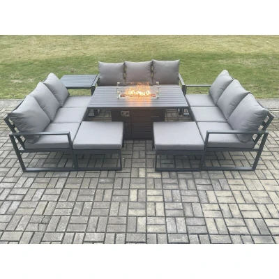 Aluminium 11 Seater Garden Furniture Outdoor Set Patio Lounge Sofa Gas Fire Pit Dining Table with 2 Big Footstools Side Dark Grey Fimous