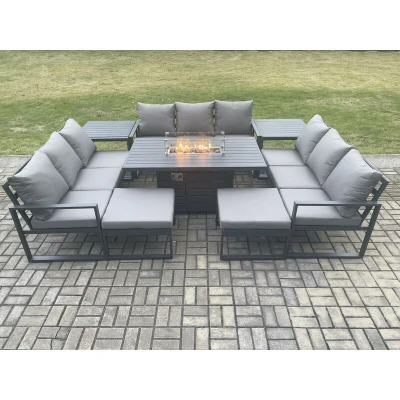 Aluminium 11 Seater Garden Furniture Outdoor Set Patio Lounge Sofa Gas Fire Pit Dining Table with 2 Big Footstools Side Tables Dark Grey