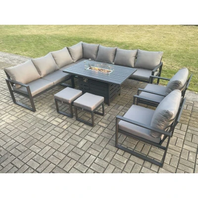 Aluminium 11 Seater Garden Furniture Outdoor Set Patio Lounge Sofa Gas Fire Pit Dining Table with 2 Chairs Small Footstools Dark Grey Fimous