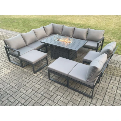 Aluminium 11 Seater Lounge Corner Sofa Outdoor Garden Furniture Sets Gas Fire Pit Dining Table Set with 2 Big Footstools Dark Grey Fimous