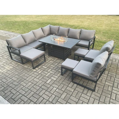 Aluminium 12 Seater Lounge Corner Sofa Outdoor Garden Furniture Sets Gas Fire Pit Dining Table Set with 3 Footstools Dark Grey Fimous