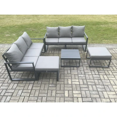 Aluminium 5 Pieces Garden Furniture Sofa Set with Cushions 8 Seater Outdoor Patio Square Coffee Table 2 Big Footstools Dark Grey Fimous